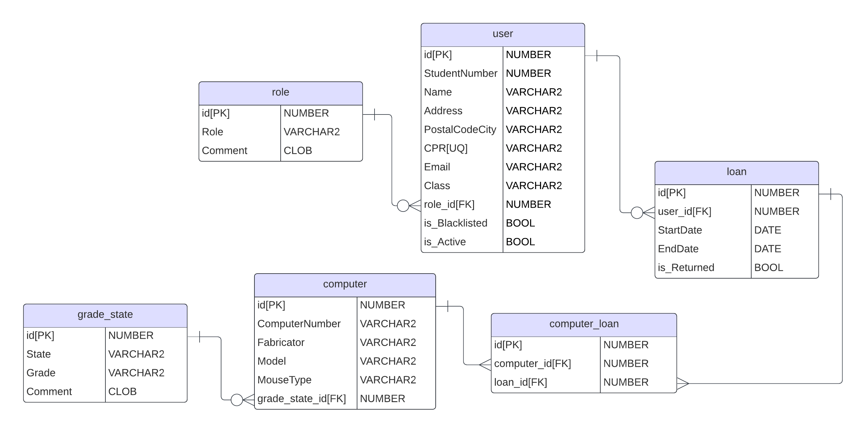 Jeg skulle i skoleoplæringen lave et database-diagram til registrering af udlån af computere. Dette skulle kunne implementeres i en Oracle-database.